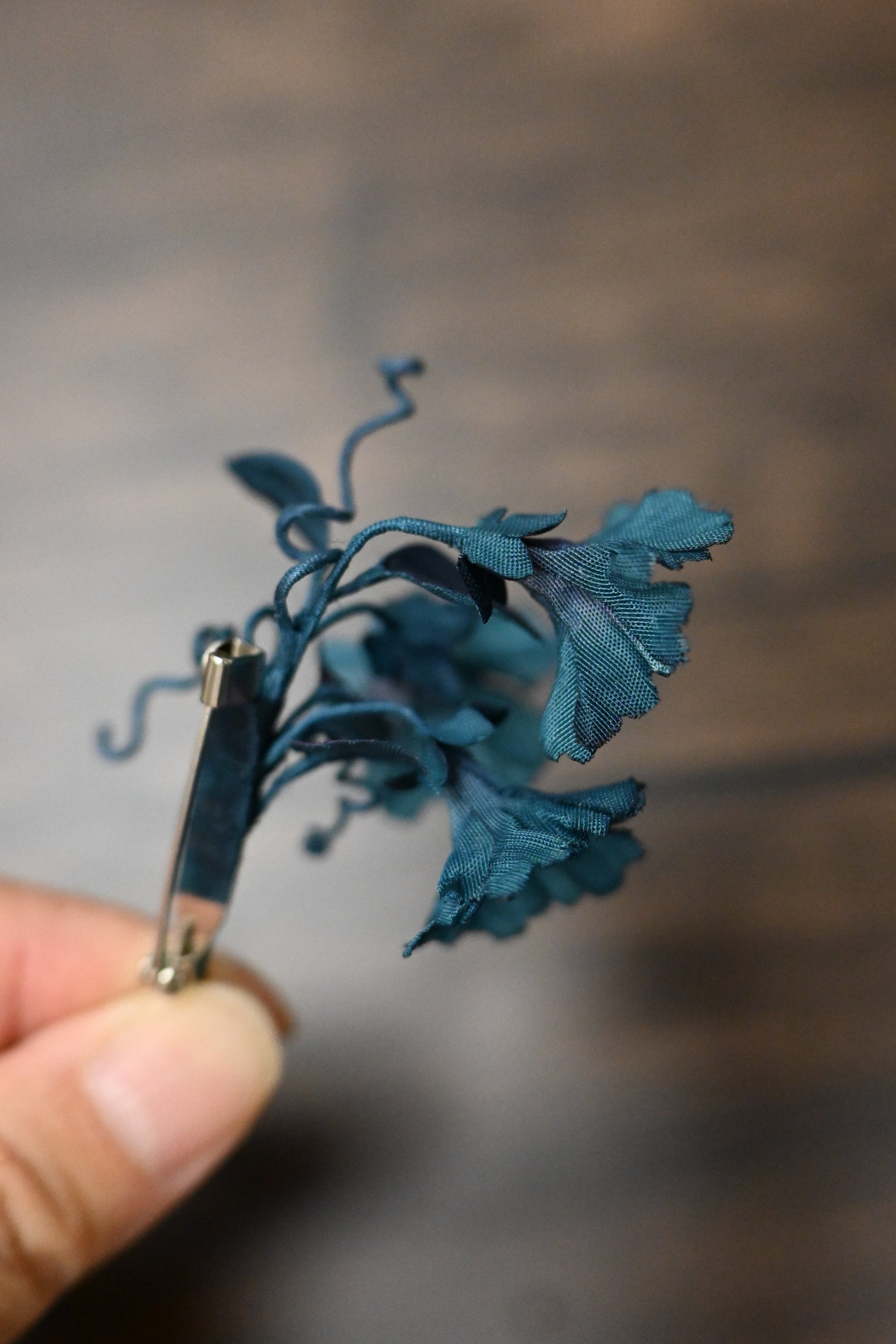 琉璃色系。 牽牛花心口針尺寸|約 W6 x H5 x D3.5 厘米布料|歐根紗、薄絹布 (均為日本製造)